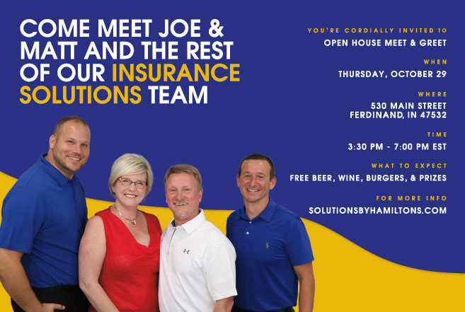 The event will take place at the Solutions by Hamiltons offices, located at 530 Main Street in Ferdinand (Historic J. Herman Beckman Building). From 3:30-7:00 PM, they will be offering free beer, wine, burgers, and prizes to those in attendance. Anyone is welcome to attend and see their offices, meet their staff, as well as ask questions about insurance or any other business solutions offered.